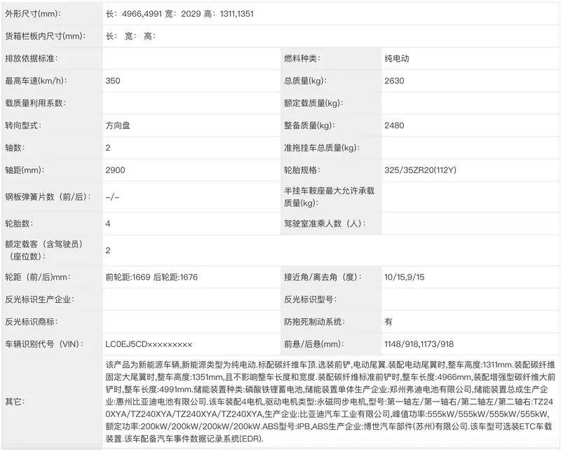 動力方面,新車搭載了四臺型號為TZ240XYA的電機,單電機峰值功率555kW,綜合功率達到 2220kW。電池方面,新車搭載 鄭州弗迪生產(chǎn)的磷酸鐵鋰蓄電池。
