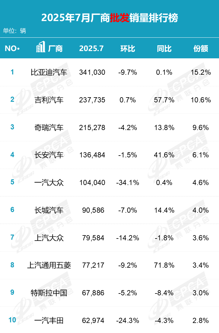 比亞迪雖然以月銷(xiāo)341030輛的成績(jī)依然大幅領(lǐng)先于排在第二的吉利汽車(chē),但9.7%的顯著環(huán)比跌幅,讓這份榮耀略顯沉重。值得一提的是除吉利汽車(chē)環(huán)比增長(zhǎng)0.7%之外,排在7月銷(xiāo)量榜前十的車(chē)企均出現(xiàn)了不同程度的環(huán)比下降。