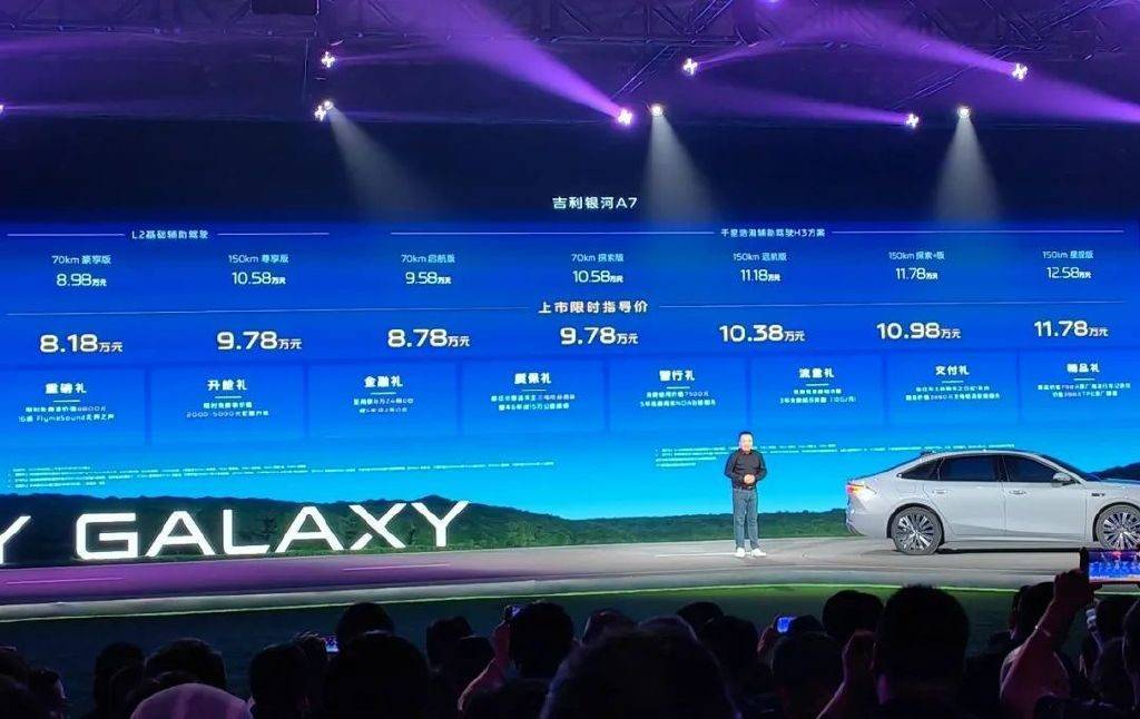作為“電混家轎顛覆者”的吉利銀河A7基于GEA全球智能新能源架構(gòu)打造,于8月8日正式上市,共推出7款車型,售價區(qū)間為8.98-12.58萬元,限時指導(dǎo)價8.18-11.78萬元,較原價直降8000元,更比秦L DM-i的起售價低1.8萬元。這一顛覆性定價策略不僅擊穿了混動家轎長期固守的10萬元心理防線,更將B+級混動轎車的門檻拉至燃油A級車區(qū)間(如軒逸、朗逸),形成跨維度競爭。