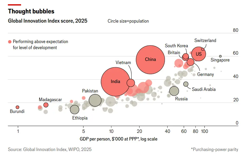 世界知識產權組織的多項指標已考慮到經濟體的規(guī)模和人口數量差異。例如,研發(fā)支出并非以“美元絕對值”計算,而是以“占GDP的百分比”衡量;研究人員數量則按“每百萬人口中的研究人員數”統(tǒng)計。今年(2025年)排名第一的仍是小國瑞士,瑞典和美國分別位列第二、第三。