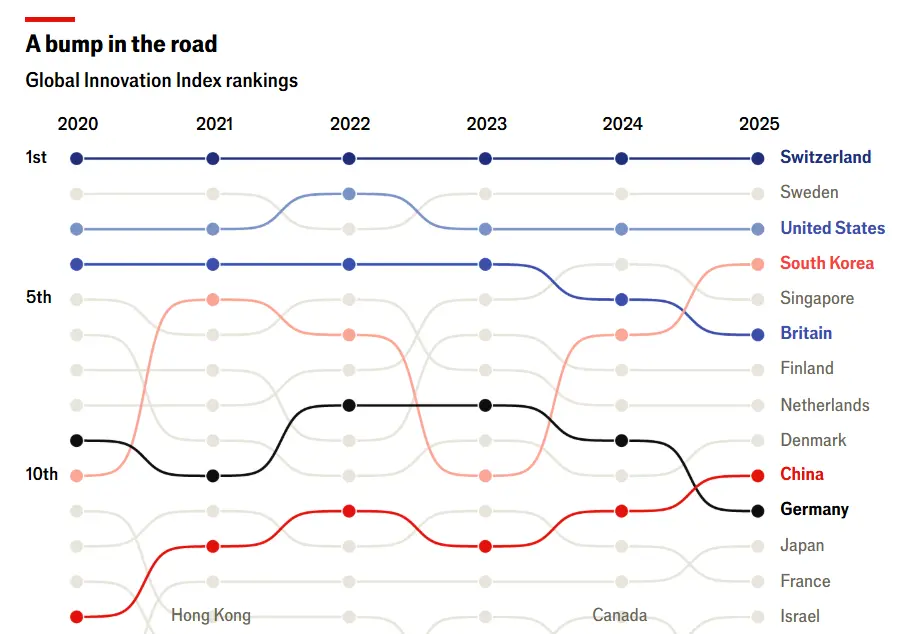 德國人向來擅長發(fā)明創(chuàng)造。印刷機、汽車、X光機均出自他們之手,更不用說MP3播放器和小熊軟糖了。如今,德國仍是推動技術進步的重要力量——2024年,該國提交的國際專利申請數量超過1.67萬件。但根據世界知識產權組織(WIPO)發(fā)布的涵蓋139個經濟體的最新全球排名,德國已不再位列全球十大創(chuàng)新國家,其席位被中國取代。